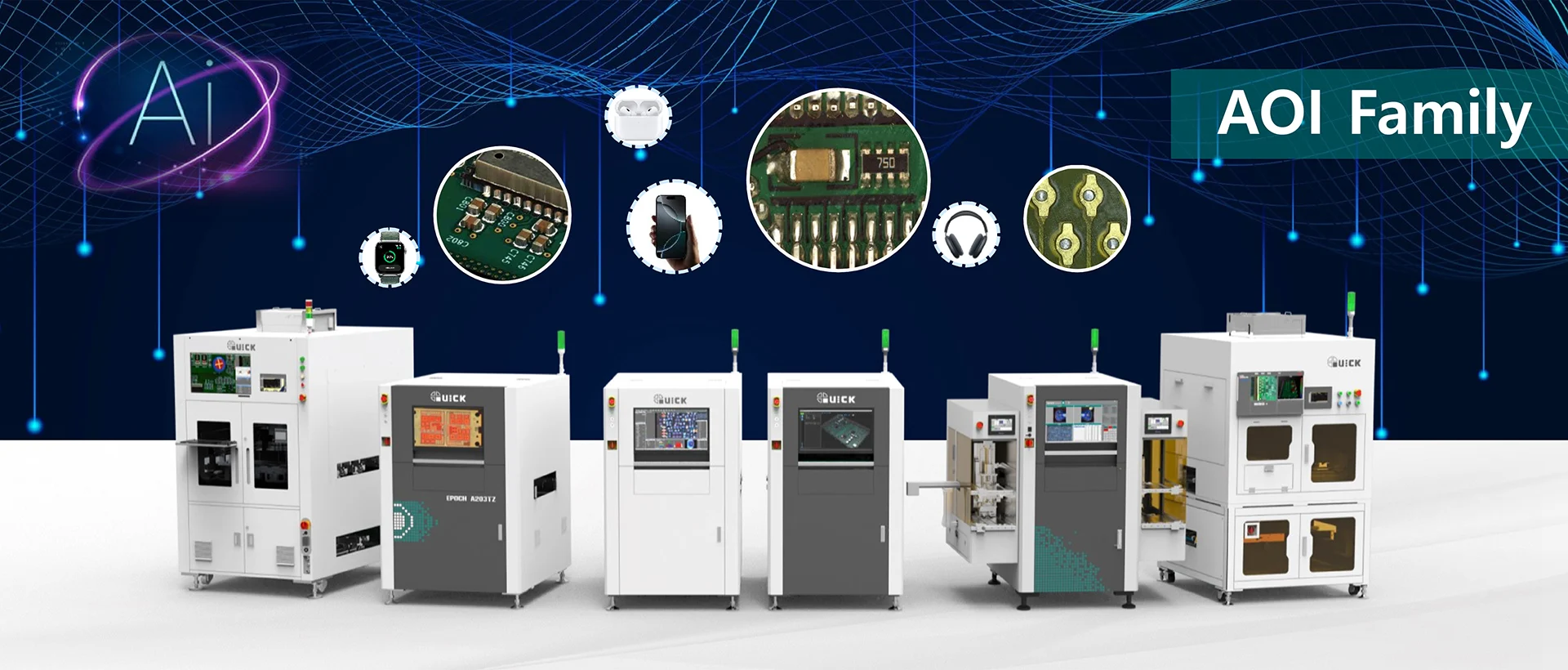 Danh mục sản phẩm nổi bật của QUICK bao gồm máy gắn chip đa năng, máy gắn chip eutectic, hệ thống ép thiêu kết bạc (Ag sintering), hàn bằng axit formic, hàn laser, hàn chọn lọc, khắc laser, kiểm tra quang học 3D (3D AOI) và các giải pháp tự động hóa tích hợp, phục vụ đa dạng lĩnh vực trong ngành công nghiệp điện tử và bán dẫn.