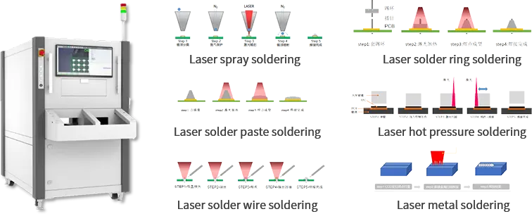 Hệ thống hàn laser của chúng tôi hỗ trợ nhiều phương pháp khác nhau như phun thiếc laser, hàn bằng kem hàn, dây hàn, vòng hàn, ép nóng laser và hàn vật liệu kim loại. Mỗi giải pháp được thiết kế để phù hợp với từng loại sản phẩm, linh kiện và yêu cầu công nghệ cụ thể.