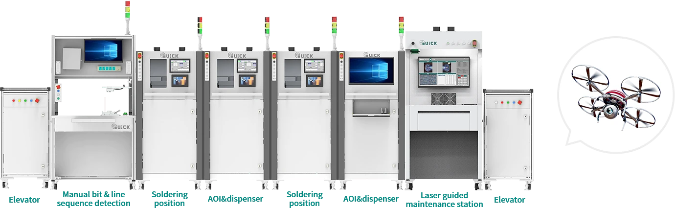 Quy trình sản xuất bao gồm: kiểm tra trình tự tuyến, định vị sản phẩm bằng CCD, hàn tự động, kiểm tra mối hàn bằng AOI, phủ keo và các công đoạn khác.