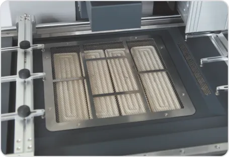 Sử dụng bốn bộ đĩa sứ gia nhiệt hồng ngoại bước sóng dài với công suất đỉnh lên đến 1600 W. Kích thước bệ được mở rộng hơn, cho phép preheat các PCB kích thước lớn hơn, đồng thời đảm bảo nhiệt độ phân bố đồng đều, ngăn ngừa quá nhiệt cục bộ, biến dạng và cong vênh.