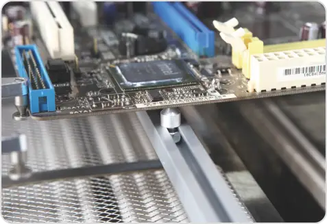 Các PCB không đều có thể được cố định ngang bằng nhiều loại đồ gá khác nhau, trong khi các PCB lớn được chống đỡ từ phía dưới bằng các chốt chống sập để ngăn ngừa biến dạng.